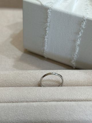 シンプルなストレートの指輪ですが、ダイヤが真ん中に埋め込まれていることにより、動くとキラキラ輝いてとても綺麗です。ウェーブタイプの指輪と悩みましたが、ストレートタイプの方がキラキラ光って見えて、デザインもずっとこれからつけていても飽きないと思うので選んで良かったなと思います。