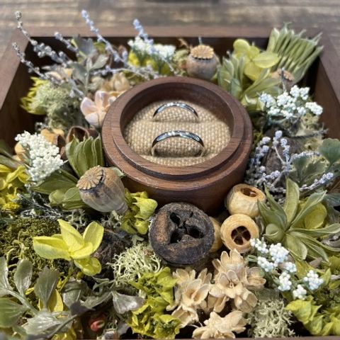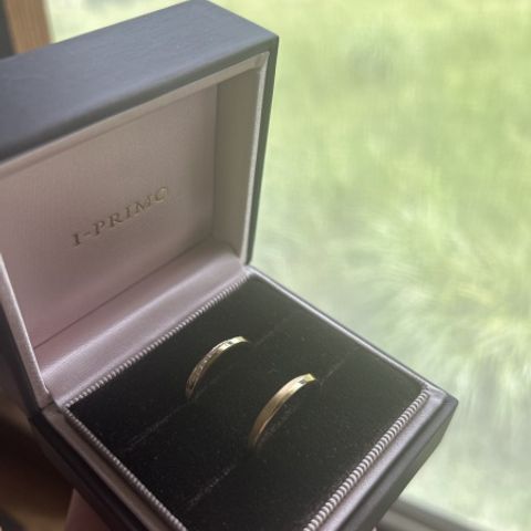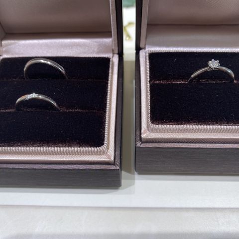 ふたり同じシリーズのデザインを選ぶことで統一感を出せました。女性側には、自分と相手の誕生石+サムシングブルーとしてブルーの石を入れていただきました。男性側にも一石ダイヤを入れてもらいました。こちらのわがままを全て聞いていただいて感謝しかないです。 また、ミンサー柄の刻印もダメ元でお願いしたところ快く受け入れてくださいました。