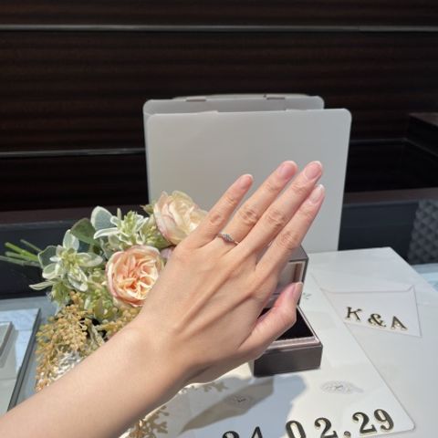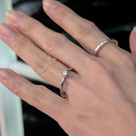 婚約指輪は既に持っていたので、重ね付けして見栄えが良いものを、スタッフさんと一緒に選ぶことができました。斜めに流れるようなダイヤモンドがキラキラと輝いてとても素敵な指輪だと感じています。握る側のリングが細くなっていて、馴染みが良いのも気に入っています。