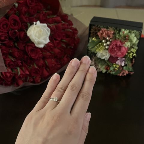 【指輪のデザイン】 指が細い彼女に合うように、「リリーズ」というラザールダイヤモンドの指輪の中でも細いデザインのもの。 横から見た時の見た目も可愛らしく、頑丈とのこと。 【ダイヤモンド】 4cにこだわったもの。