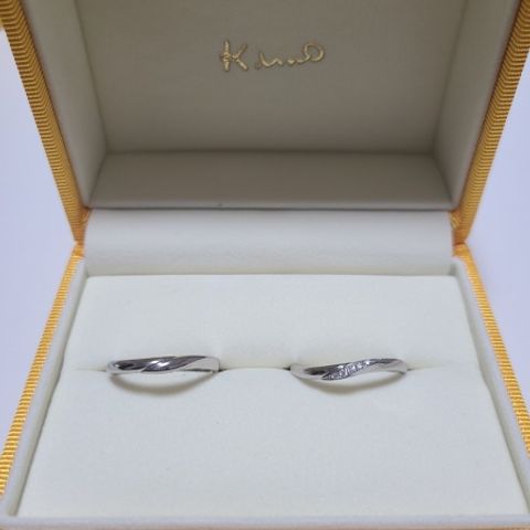 手になじみやすいウェーブタイプにしました。 新婦のほうの指輪にはダイヤモンドを入れることで、手元に輝きが出るように仕上げていただきました。 シンプルながらおしゃれなデザインが普段着けにもあっていてとても気に入っております。