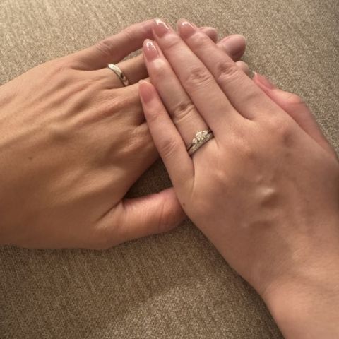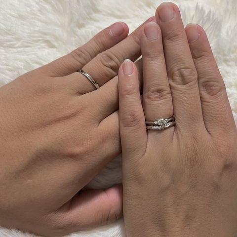 歳を重ねても違和感なく付けられるような、普遍的に良いと感じられるデザインだと思いました。 妻の婚約指輪は別で購入したのですが、デザイン的にも、形状的にも、重ねづけに大変良くマッチしていたのも決め手です。 男性側の方の指輪としても、「2人で想いは共有しつつ、ビジネスシーンにも馴染むもの」を探していた私には、しっかりコンセプトを共有しつつ、洗練された指輪ということでマッチしていました。