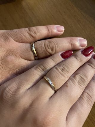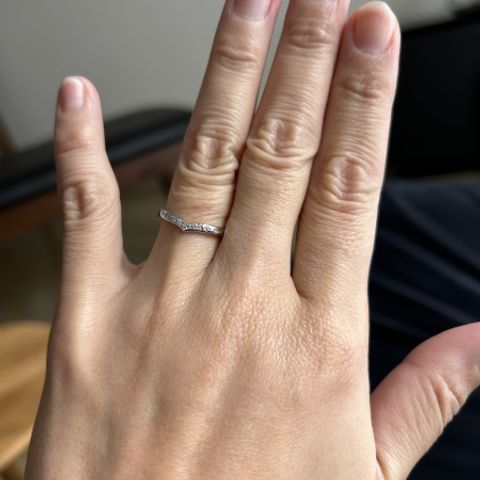ウェーブの指輪が好みで指に付けたところ、とても可愛い印象で満足しています。 ダイアがたくさん付いているのが好みではなかったのですが理想の見た目の物が見つかりました。 旦那とはペアの指輪ではなくそれぞれ好みの指輪を購入しました。 お互いとても素敵な指輪に出会えました。