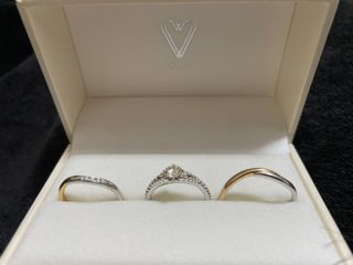 ダイヤがキラキラしており、婚約指輪と重ね付けするとさらに可愛いです!ねじりタイプでダイヤがたくさんついているところがおすすめです。男性用の指輪も様々な種類があり迷いましたが細身タイプのシンプルで着けやすいと言っていました。