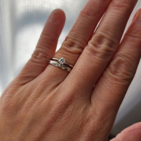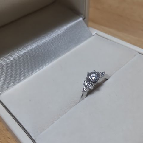 プロポーズにリングを!!と考えたけど、サイズを知らない主人が、ネット検索でプロポーズリングを知り、ダイヤモンドを購入して、プロポーズリングを作成してくれました。後日、好きな台座にダイヤを付け替えてくれる為、店舗に二人で伺いました。婚約指輪と一緒に着けれる指輪と思い、ダイヤモンドシライシさんで統一しました。 重ねづけ推奨品ではないですが、どちらもシンプルで可愛いです。つけ心地は、指輪をしたことがない主人がなれたぐらい良く、ダイヤモンドも輝きが良くとても満足です。 また価格も、婚約指輪と結婚指輪の同時購入により割引をしていただきました!