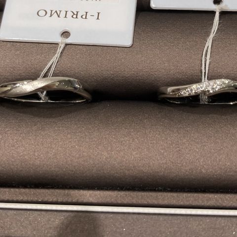 価格も1人10万円程で、お手頃だったように思います。 少し、アクセントにダイヤが入っており、購入感もありながら、全面に入っているわけではないので落ち着いた雰囲気もある指輪のように思います。夫の指輪もウェーブしており、そこもアクセントになっていると思います。