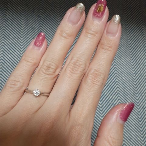 彼が選んでくれたのですが、王道かつ可愛いデザインに惹かれたそうです。上から見るとシンプルですが、横から見るとダイヤモンドの台座部分がハートになっていて、凝ってるなぁと思いました。私も凄く気に入っています。