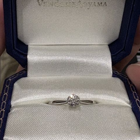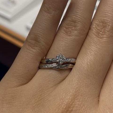 ダイヤモンドが一個、真ん中に配置されており、まさに王道の婚約指輪なところ。特別なときももちろん、日常でも使えるし、結婚指輪との重ね付けもしやすそう。ダイヤモンドの輝きもとてもきれいで、毎日つけたいくらい。