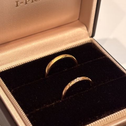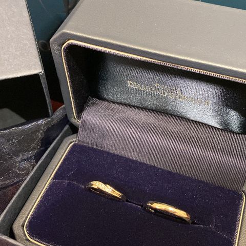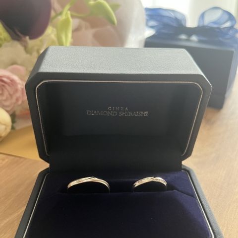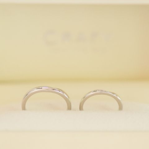 シンプルがいい、でも無地だと地味すぎるかなぁ…と思っていた中で、梨地のマット加工を斜めに切り込みで入れらました。内側にはお互いの名前、出会ったものにちなんで雪の結晶マークを入れることができました。 私の方にはダイヤモンドも一粒。シンプルかつエレガントな仕上がりになりました!
