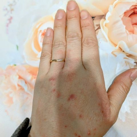 ピンクゴールドが肌になじむ。 ゆるやかなカーブで指がスッキリ。 適度なデザイン性が手元を適度に華やかにしてくれる。 1本線のようなほんの少し細い幅(約2.4mm)で 関節がやや目立つ手に対して、骨感をカバーできないと感じた。