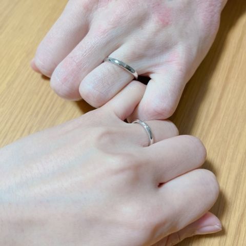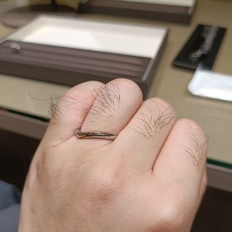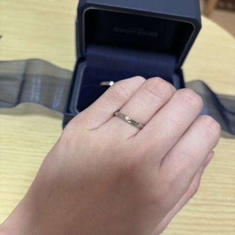 シンプルなデザインで、普段からつけやすいものを探していましたが、ピッタリなものが見つかりました。正面からだけでなく、リングを横から見た時にもダイヤが見えるのがおすすめです。また、ぴったりの指輪が見つかるよう診断もしてもらい、少しうねった形のデザインを選びました。