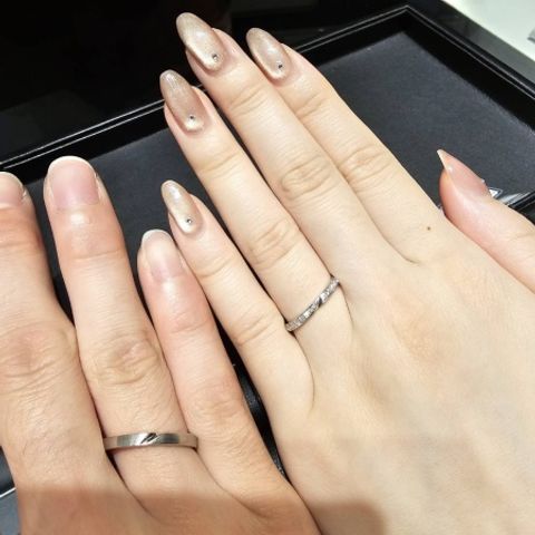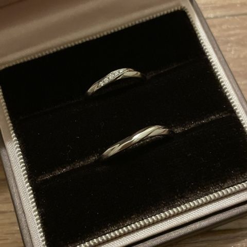 デザイン性があるのでペアリング感が強く、指輪に込められた想いも魅力的でした。 リングに少しひねりがあることで、指が細く綺麗に見えるような気がしました。 女性側の指輪にはダイアモンドがありますが、男性側の指輪にはマット加工というものができました。
