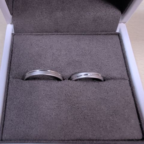シンプルでどんな服装にも合いそうです。 プラチナ製でマット加工されていて余り目立たずカッコいい感じ。 女性の指輪は小さいダイヤがあしらってあります。 さり気なさがあって気に入ってます。 男性の指輪はラインのみでシンプルです。