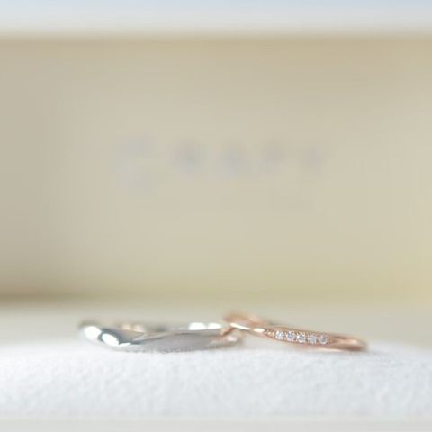指輪のデザインがとてもお気に入り。 新婦の指の特徴に合わせて ウェーブかかったデザインのを選び 新郎はそれに合わせてウェーブの色をコンビにし ピンクゴールドの色で合わせ お互いとても納得いく指輪をえらぶことができた。