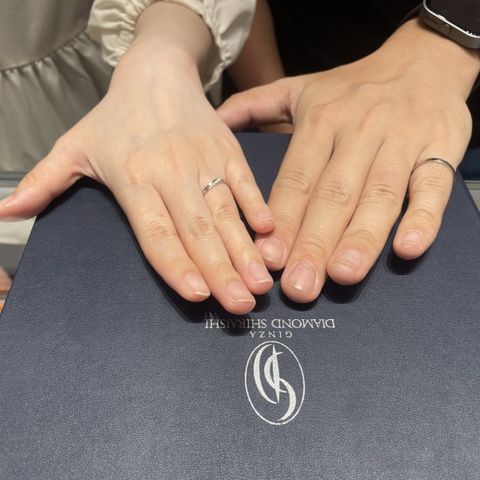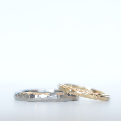彼が鍛造で作られている指輪がいい!と希望があり、探していました。私は仕事時は指輪ができないので、わたしのものはダイヤ付き、彼のものは彼好みにシンプルで探し、どちらも満足のいくものが出来上がりとても嬉しいです!