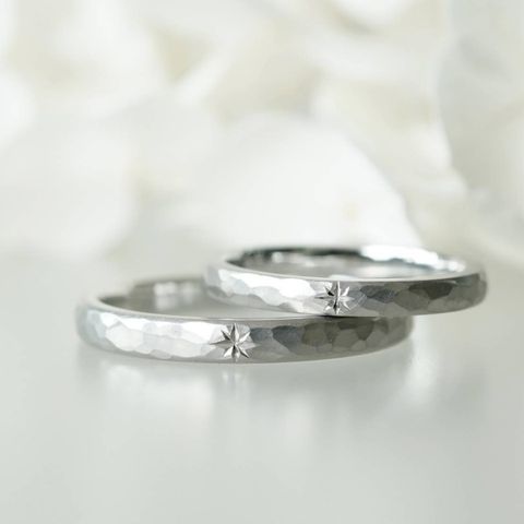 指輪のデザインとしては3点あり、まず1点目が表面に槌で打ち付けたようなテクスチャをいれ、2点目に表面中央部に星のデザインを入れることでオリジナル感だけでなくオシャレなデザインになるようにしています。 3点目に裏面にお互いの頭文字をいれてます。