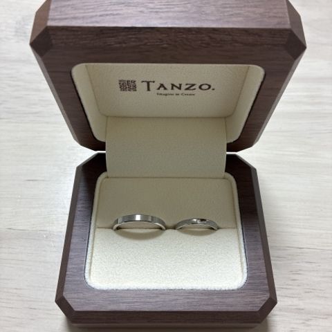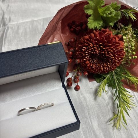 縦ラインに加えて、レディースリングのくびれやダイヤの大きさ・配置まで、理想をそのまま形にしていただけたのが本当に嬉しかったです。 ダイヤを外側に向けて大きくするなど、細部にまでこだわれたことで、上品ながらもしっかり個性が感じられる絶妙なバランスになったのではないかと思います。 長く大切にしていきたいと思える指輪に仕上げていただきました!