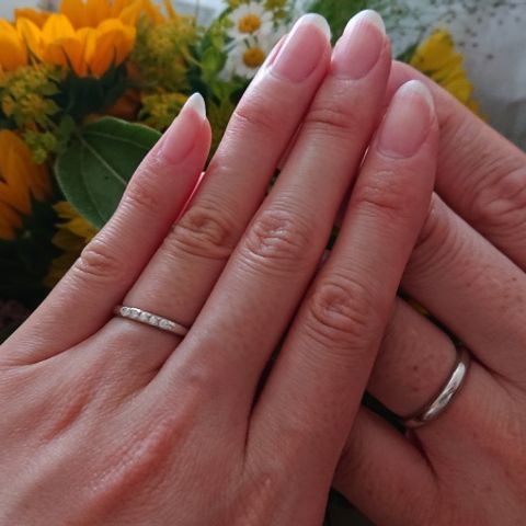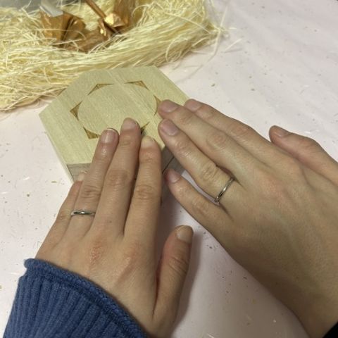 指輪を制作できることが大切な思い出となり、形も大きさも違うけれど、2人で同じ目的の指輪を作ることが楽しく出来上がりがとても楽しみでした!指輪が届き、出来上がりを見たときにここはこうやって作ったね〜、ここが難しかったねなどの会話ができるのも手作り指輪ならではだと思います。これからもずっと身に着けていたいと思える仕上がりになりました!