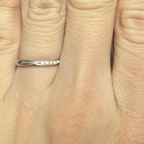 シンプルでどんな場面でも着用できる。 ダイヤがキラキラしていて、とてもきれい! ずっと付けてても違和感がない。 飽きることがなさそう。 ちょっとウェーブしたデザインで、結婚指輪や、他の指輪と重ね付けしても合う。