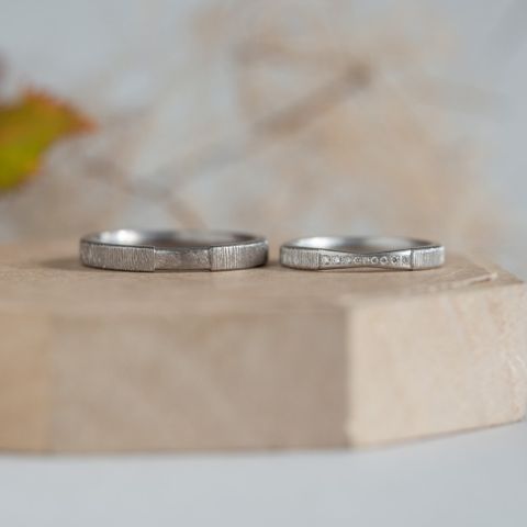 王道の結婚指輪のスタイルではなくて、自分たちらしい少し変わったデザインを探していたのでピッタリのものが見つかりました。 ツヤっとした普通の加工ではなく、マット加工とダイヤモンドバーという加工を施しました。 加工もオプションではなく無料で対応してくださり満足しています。