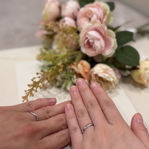 シンプルな中にオリジナルを出したくて、ダイヤを追加しました。センターにダイヤがあるだけではなく、ラインが入っているのが、お気に入りです。夫の指輪にはマット加工でダイヤを施して頂き、大変満足しております。