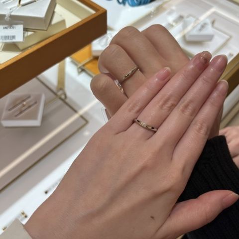 手の形が違うためペアリングを選ぶことはできませんでしたが、 形の似たもので店員さんにデザインを合わせてもらいました。 付け心地がよく、外れにくいものと、お互い好みに合うよう選びました。お互いの納得できる指輪を見つけられてよかったです。