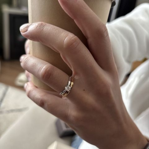 ウェーブがかかったデザインで、コンビネーションカラーがさりげないオシャレな指輪です。 来店前はシンプル王道のストレートを選ぶつもりでしたが、実際に試着してみるとこの細身で繊細な2粒ダイヤに一目惚れしてしまいました。 毎日つけるものなので、あえて可愛らしくテンションがあがるようなデザイン性の高いものを選ぶのも1つの選択肢だと思います。