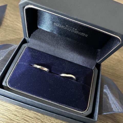 ウェーブがかかったデザインで、コンビネーションカラーがさりげないオシャレな指輪です。 来店前はシンプル王道のストレートを選ぶつもりでしたが、実際に試着してみるとこの細身で繊細な2粒ダイヤに一目惚れしてしまいました。 毎日つけるものなので、あえて可愛らしくテンションがあがるようなデザイン性の高いものを選ぶのも1つの選択肢だと思います。