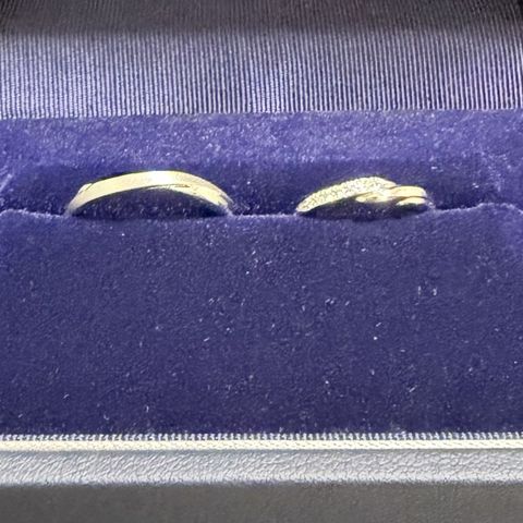 まっすぐではなく、ウェーブしてるタイプが良くてキラキラしているダイヤが入ったこの形がとても気に入りました。 鍛造製ですごく強度があり、アフターサービスもとても良いです。 ダイヤが5個入っていて、キラキラするのがとっても可愛いです。また内側に誕生石が入っていて、そこもまたお気に入りのポイントです。 彼の方はマット加工が入っており、シンプルながらもおしゃれなデザインになっています!