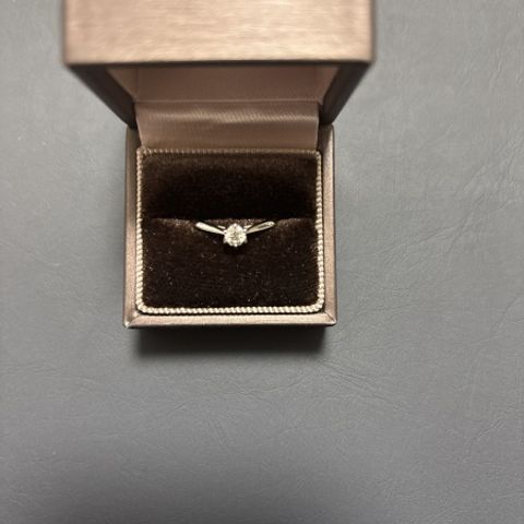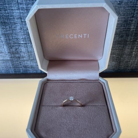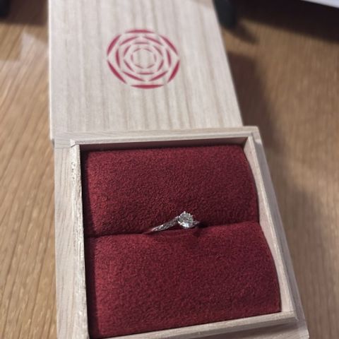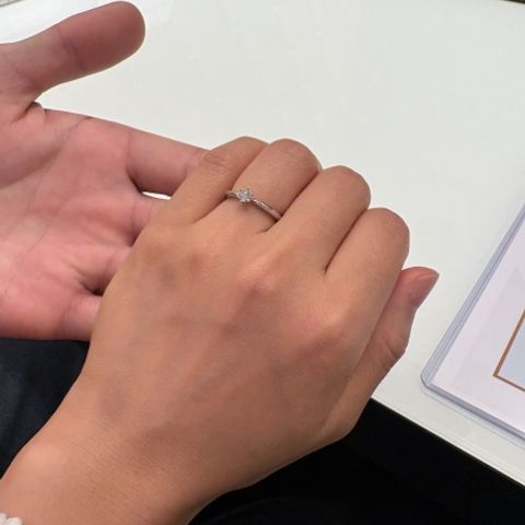 デザインに大満足です。真ん中のダイヤモンドを周囲の小さなダイヤモンドが邪魔しない程度に際立たせている。リングも太すぎず細すぎずちょうど良い。0.26CTですがとても存在感があってずっとつけていたくなるデザイン。