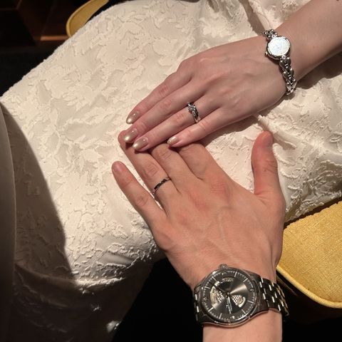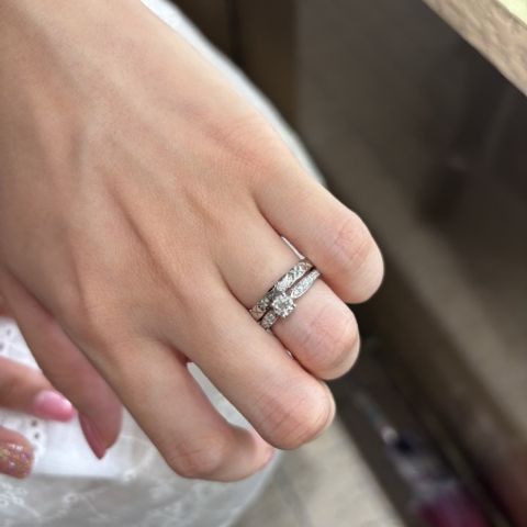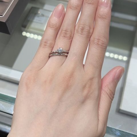 王道、シンプルで、禍々しさがなく、特別な日でも普段の日でもつけやすい。また、結婚指輪と重ね付けしても、ダイヤ部分が当たらないようなデザインになっていて、フィット感がとてもお気に入り。ダイヤの大きさも、大きすぎるものよりはシンプルがよかったのでちょうど良い。