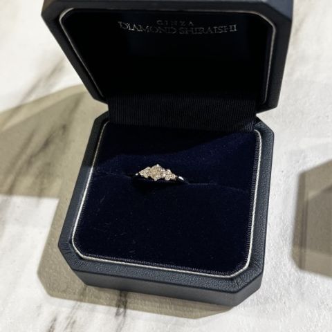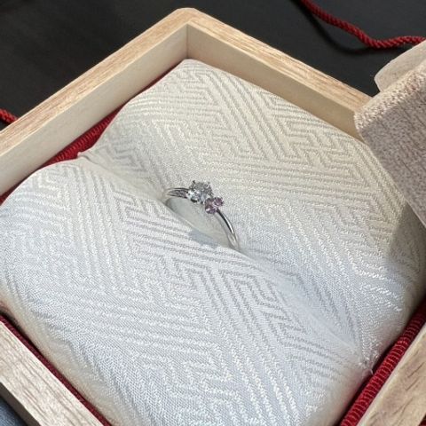 祖母の遺産のダイヤのリング。 私の指にはサイズが合わず、またデザインも好みで無かったので、友人のおすすめでケイウノさんで婚約指輪にリメイクして頂きました。 私は蛇のモチーフにしようと思っていたのですが、主人は桜のモチーフが良いとのことで、いくつかデザインいただいた中の「八重桜」モチーフのデザインに決めました。 結果として大正解でした。 0.2カラットのダイヤの存在感が増え、見応えがあります。 頼んで良かったです。