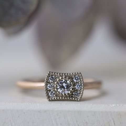 トップはもともと縦のデザインなのですが、自分の好みに合わせて横のデザインに変更してもらいました。 アンティークの雰囲気を演出するために金属部分もマット仕上げにしています。 歳を重ねてもずっと着けられる指輪になりました。 大満足です。