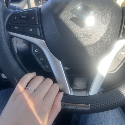 シンプルなデザインですが、ダイヤのカットが細かくどこの角度から見てもとても綺麗なダイヤの輝きがある。 リングのデザインはプロポーズ後に選ぶことができ、ダイヤを包み込むようなリングのデザインで特別感があるリングにしました!