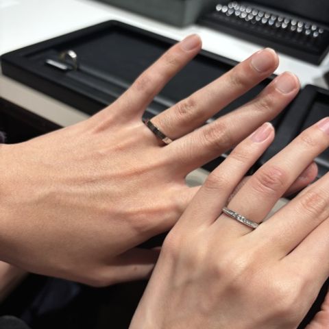 シンプルなデザイン、形、着け心地、色とすべてにこだわり、なるべく相手の指輪のデザイン似た感じなるように選びました。その中でも色はこだわり、最初違う色にしようとしていましたが、指輪の太さで色の印象が全く変わり今の色に決めました。
