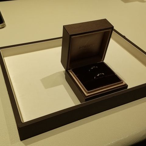 彼の手には華奢な細い指輪はどうしても馴染まず、何店舗も足を運んで実際に見比べながら探しました。その中で出会ったフォルトゥーナの指輪は、洗練されたデザインはもちろん、程よい太さと存在感があり、彼の手にとてもよく映えていました。着けた瞬間にしっくりくる感覚があり、二人とも自然と「これだね」と納得できた一本です。
