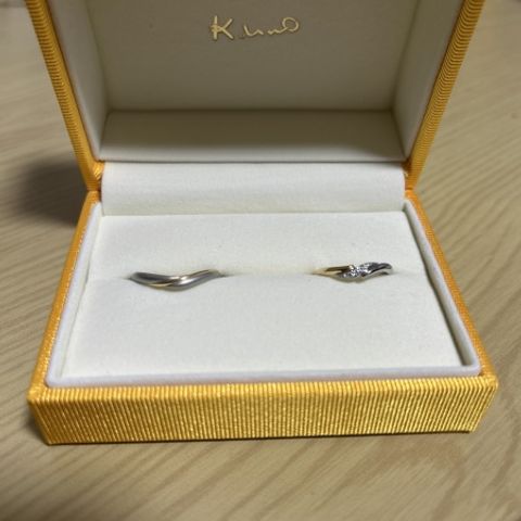 シンプルさとゴージャスさをバランス良く取り入れたデザインであるためとても気に入りました。特に、レディース側のダイヤモンドカットの形と、メンズ側のウェーブの形が同じなため、その部分をつや消し加工することでペア感が際立ち、お揃いの指輪を付けている気持ちになり気に入っていますり