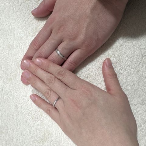 指輪は普段使いがしやすく、どんな服装でも場所でも馴染むので気に入っています! 素材も錆びにくく、強い素材で、指輪の内側には結婚記念日とイニシャルを入れていただき、唯一無二の指輪になりました。 ダイヤもキラッとさりげなく輝くので、シンプル過ぎず、派手過ぎず、気に入っております。