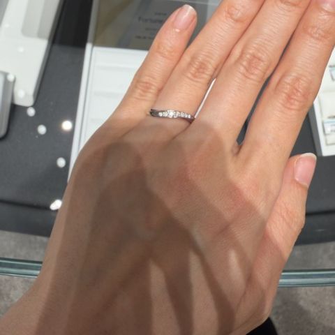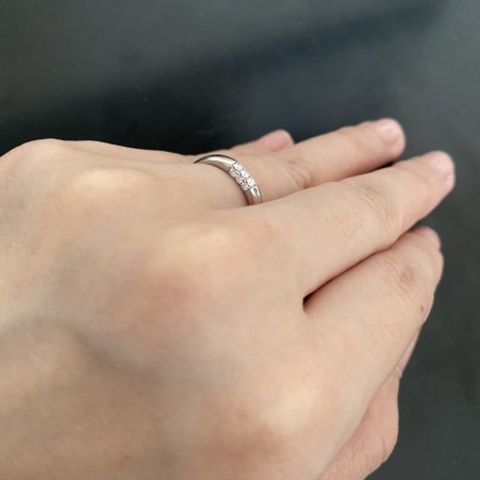 シンプルなリングより少しデザインが欲しいけど、あまりシャープな印象のものは避けたかったので、丸みのある印象のまま波打ったようなデザインが入ってる「宮」を選びました。指先側や付け根側から見てもダイヤがよく見えるデザインが個性的で気に入りました。