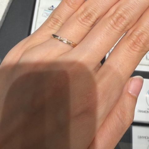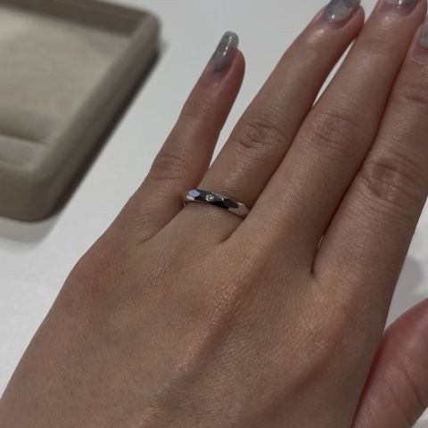 リング自体のデザインが想像以上に可愛くて、派手すぎず上品な印象を受けました。試着すると指に馴染む感じがあって、毎日つけても自然かなと思います。ダイヤも入れることができるので男女で違いをつけてつけれるのもいいなと思いました。