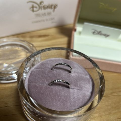 ディズニーシンデレラをイメージした結婚指輪です。元からあるデザインだと新郎側の指輪の表側にダイヤを入れることができなかったのでケイウノ既存の指輪のデザインをシンデレラのようにしてもらいました。値段をほぼディズニー既存のシンデレラのデザインと変わりません。