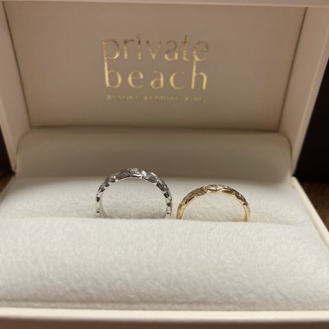 ハワイアンジュエリーが好きな彼とシンプル目がいい私の思いを込めて選びました。ゴールドのサンプルがなく、つけた時に馴染むか心配でしたが、ぴったりでした。刻印と誕生石も埋め込み見えないところまでこだわった指輪になりました。
