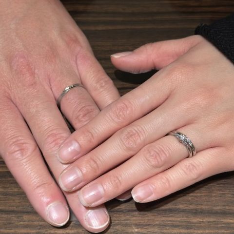 シンプルで長く着用することを考えて選びました。細すぎず、太すぎないのがちょうど良かったです。 普段指輪をつけない夫婦でしたが、着け心地もよいところがおすすめです。 また今回、私(妻)の方にダイヤを1粒つけました。デザイン的に今後ダイヤを増やすことも可能とのことで、今後10年ごとに1粒ずつダイヤを増やしていくのもい いね!と夫婦で計画できたことも楽しみが増えて嬉しかったです。