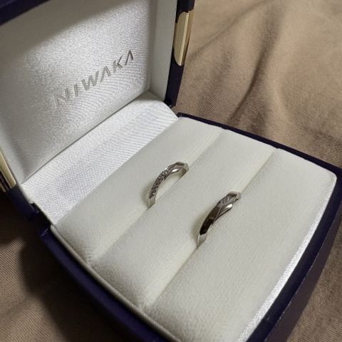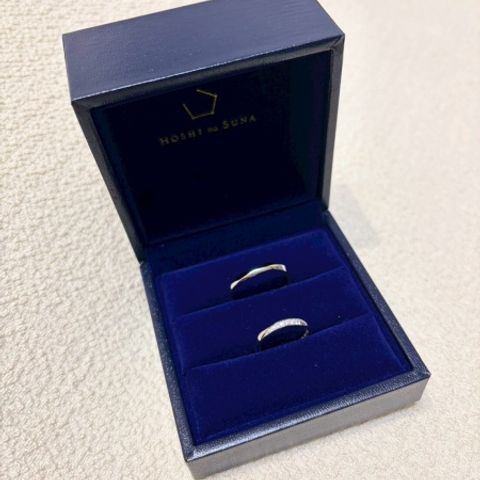様々なブランドの指輪を見に行きましたが、この指輪で初めて彼と私の意見が一致しました。 他には無いデザインで、男性用のリングの正面にマット加工がされているのがとても気に入りました。 女性用のデザインのダイヤは正面ではなくサイドから流れるように入っているので、仕事中でもギラギラせずつけられると思います。