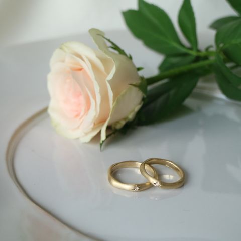 婚約指輪との重ね付けを意識しつつ、シンプルかつ上品なデザインとなるようにオーダーいたしました。奥さんも満足する仕上がりとなり、私も嬉しいです。指輪の加工を選ぶ際には実際の見本も見せていただけたので、完成形が想像しやすく、とても助かりました。