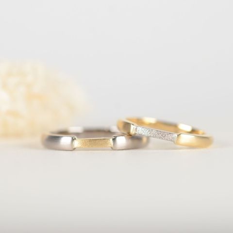 形はまっすぐでシンプルさもありますが、色がプラチナとゴールドのツートンカラーで、色で迷っていた自分たちにはピッタリでした。カラーの組み合わせも選べました。表面の加工もつや消ししたりとアレンジできそうで、今回はしなかったですが飽きが来たらお願いしたいと思います。