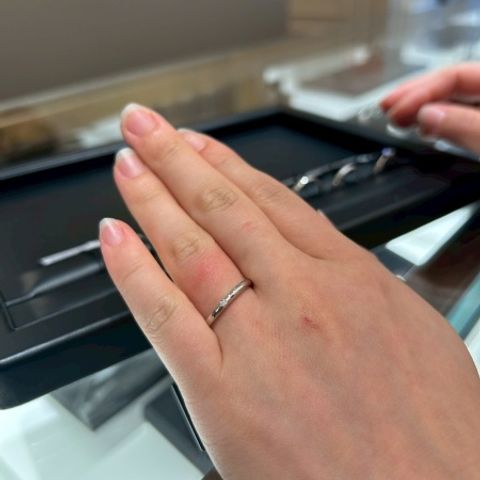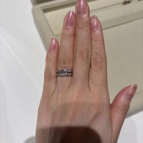 婚約指輪に重ね付けをしても、可愛いものが良かったので、シンプルなものを試着しました。こちらは、丸みがあり、婚約指輪とも相性が良かったです。シンプルですが、真ん中のダイヤモンドがとても存在感がありました。