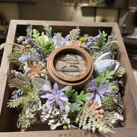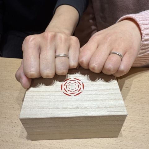 出雲結さんは8種類の指輪からどのデザインが好きかで選びます。一つ一つ丁寧に説明してくださり、どんな意味があるのかどんな特徴があるのか、全て拝見しました。また、形だけでなく色や光沢感の違いも全て見せてくれ、付けることが出来たので後悔なく選ぶことができました。 私が選んだのは「祈結」です。シンプルなものかキラキラした物かで悩みました。キラキラした物が好きでつけたかった思いがありましたが、職業的にキラキラしたものを選択するのを悩んでいました。しかし、祈結の由来や担当の方から背中を押していただいたこともあり決めました。彼もこのデザインが1番気に入り、2人でとてと満足する指輪を選ぶことができました。