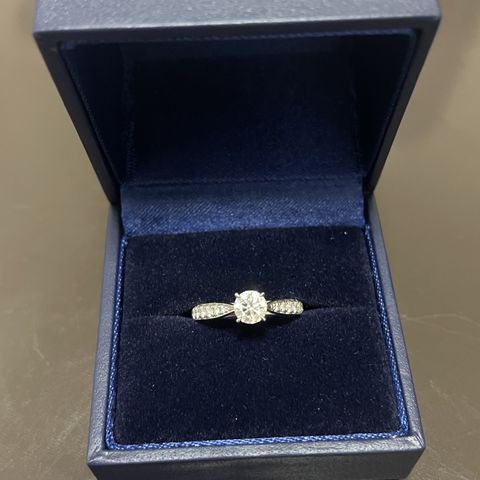 0.3カラット、Eカラー、VVS1、excellentカットです。どんな角度から見てもキラキラしていて素敵です。ペルレと迷いましたが、こちらの指輪はサイズ変更が可能であることが決め手となりました。結婚指輪もストレートなラインのため、重ね付けをしたときにも相性がよいです。