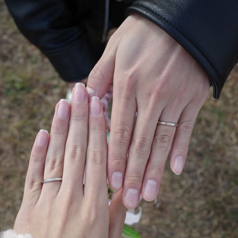 マットな指輪が欲しかったのですがキラキラも捨てがたいということで、テクスチャを切り替えるデザインにしました。フリージアのデザインはベースが鏡面、ねじれ部がダイヤモンドマットですが、私たちはマットベースの少しツヤが欲しかったので、ベースとねじれ部を逆のテクスチャにしました。これがとてもよかったです!!回転させることでカジュアルな雰囲気や少しリッチな雰囲気など何パターンか雰囲気を変えられるところも気に入っています。